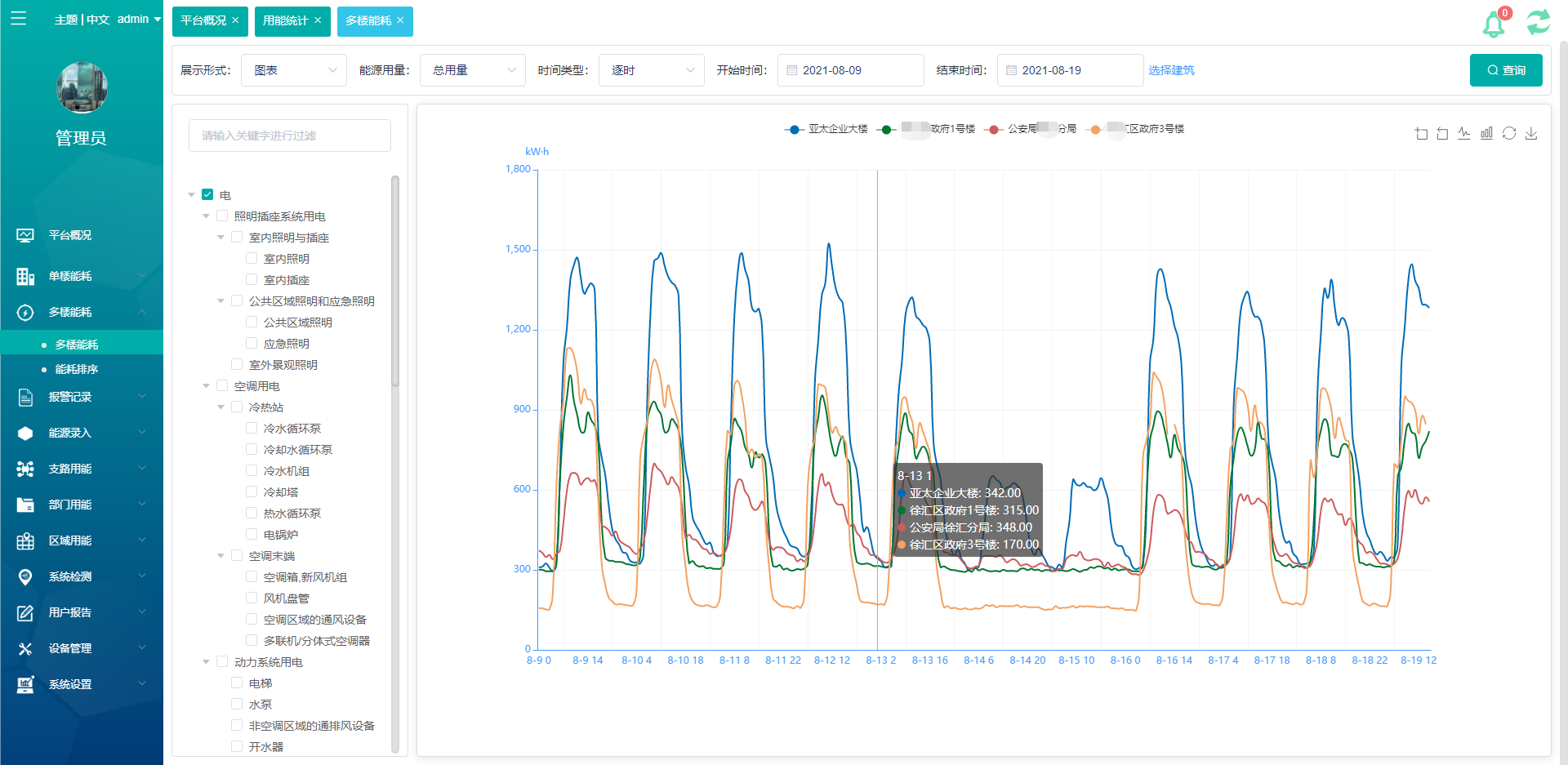 多建筑能耗分析主要是将多栋建筑的分类或分项用能情况放到统一界面中。可按逐时、逐日、逐月、逐年的方式查看选中建筑的分了或分项数据。数据通过曲线图或表格形式展示。