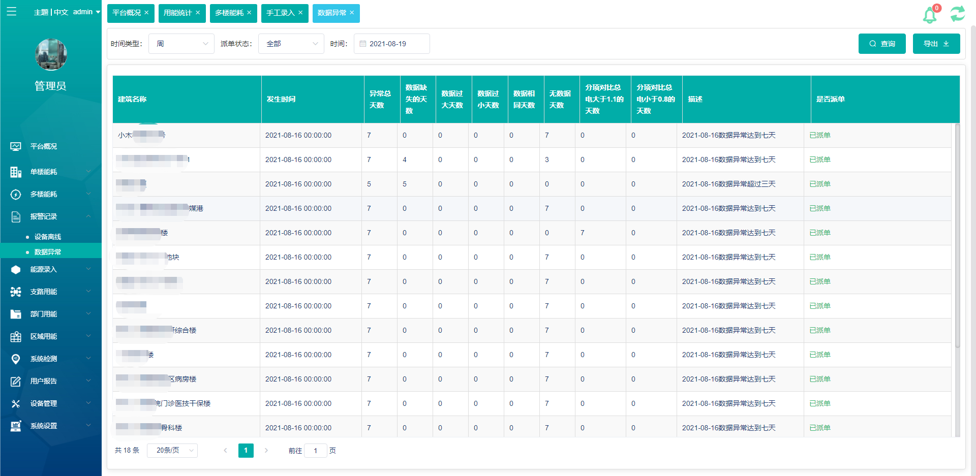 平台接入并维护多栋建筑的数据,建筑现场情况多种多样,为保证系统持续稳定的运行以及数据的准确与可靠,平台中增加了数据异常检查功能,当数据检查时不符合预定的情况时,及时产生报警并生成工单派发到维护管理人员邮箱中。