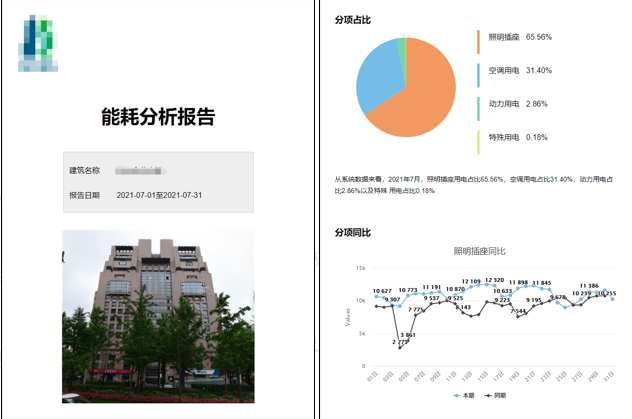 用户报告主要内容包含各分类能源消耗量的趋势分析、对比分析、占比分析等,还包含数据异常统计情况与派单情况。