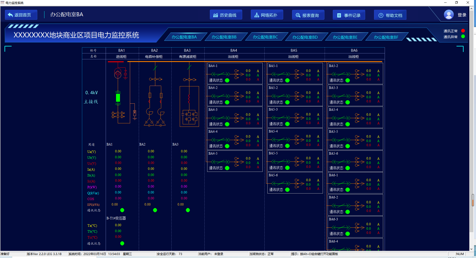 系统人机界面友好,以配电一次图的形式直观显示配电线路的运行状态,实时监测各回路电压、电流、功率、功率因数、电能等电参数信息,动态监视各配电回路断路器、隔离开关、地刀等合分状态、柴油发电机状态、柴油液位、UPS状态、电池信息等,以及有关故障、告警等信号。